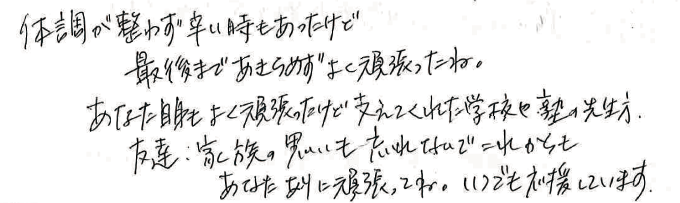 受験の試験科目に合わせ本人と室長先生と話し、また、保護者の思いや考えを理解していただき本人のやる気、諦めない気持ちを継続してもらい、メンタル面を安定させながら、苦手科目の授業、学習を継続することができました。本人の意識はしっかりと目標を見据え、やるべきことを継続できるようになりました。得意な科目をしっかり学習でき、第一希望の学校に合格でき、本人も親も驚きと感謝でいっぱいです。