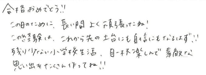算数が苦手だったので、集団塾のテキストを用いて復習をしたり、試験結果を分析して頂き、苦手分野を洗い流し、集中的に補習していただきました。6年生の夏休み後からは、先生からも算数は決してできないわけではないので、苦手意識を捨てましょう!と言っていただき、自信を持って受験に臨めたと思います。私が勉強に口を出すと、つい険悪なムードになってしまう我が家では、家庭学習を全てファースト個別の先生に丸投げさせてもらうことで、最後まで娘も他の家族も笑顔のまま過ごすことができました。