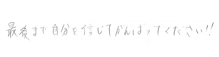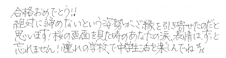 塾選びのサイトでご近所の個別指導を探していたことが、入塾のきっかけでした。大手集団塾も利用していましたが、息子はファースト個別が大好きで、中学受験終了後もファースト個別一本で続けさせていただく予定です。 苦手科目だった算数では、途中式で部分点がもらえることもあるため、丁寧に書くようご指導いただきました。その結果、枠内にきれいにまとめて書けるようになり、試験当日も部分点を多くいただけたのではないかと思います。 ■これから受験生のお子様をサポートする保護者様へ 永遠のように長く感じられる一年でした。でもその一年も必ず終わりが来ます。頑張るお子様を信じて最後まで伴走してあげて下さい!!!