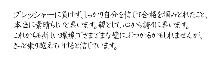 最後に、プレッシャーの中でも自分を信じて最後まで努力を重ね、合格を勝ち取ったことを本当に誇りに思います。これから先、新しい環境の中でさまざまな壁にぶつかることもあるかもしれませんが、今回の経験があれば、きっと乗り越えていけると信じています。本当におめでとう。