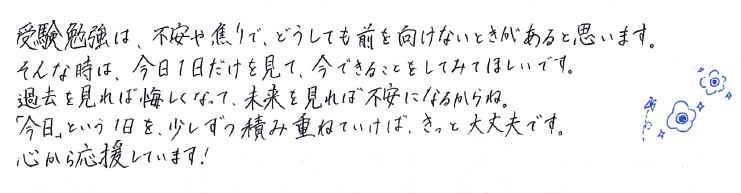 通っていて特に良かったのは、「今の自分に何が足りないのか」「次に何をやるべきか」が明確になったことです。勉強に対して漠然と不安を抱えるのではなく、一つひとつ課題を整理しながら前に進めたことで、最後までやり切ることができました。