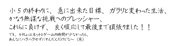 実質8〜9か月の期間で、小4〜小6のテキストと過去問の全てを網羅する必要があり、無駄・無理・ムラの許されない状況の中、子どもに適したカリキュラムを立て、個別指導ならではのオーダーメイドの指導をしていただきました。また、授業だけでなく、睡眠時間の確保や家庭での勉強方法など、生活面についても塾長からアドバイスをいただきました。